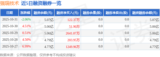 强瑞技术融资融券信息显示,融资方面,当日融资买入8506.58万元,融资偿还8384.22万元,融资净买入122.37万元,连续3日净买入累计2815.34万元。融券方面,融券卖出0.0股,融券偿还0.0股,融券余量0.0股,融券余额0.0万元。融资融券余额5.07亿元。