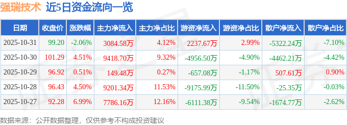 证券之星消息,截至2025年10月31日收盘,强瑞技术(301128)报收于99.2元,下跌2.06%,换手率8.43%,成交量7.44万手,成交额7.49亿元。
